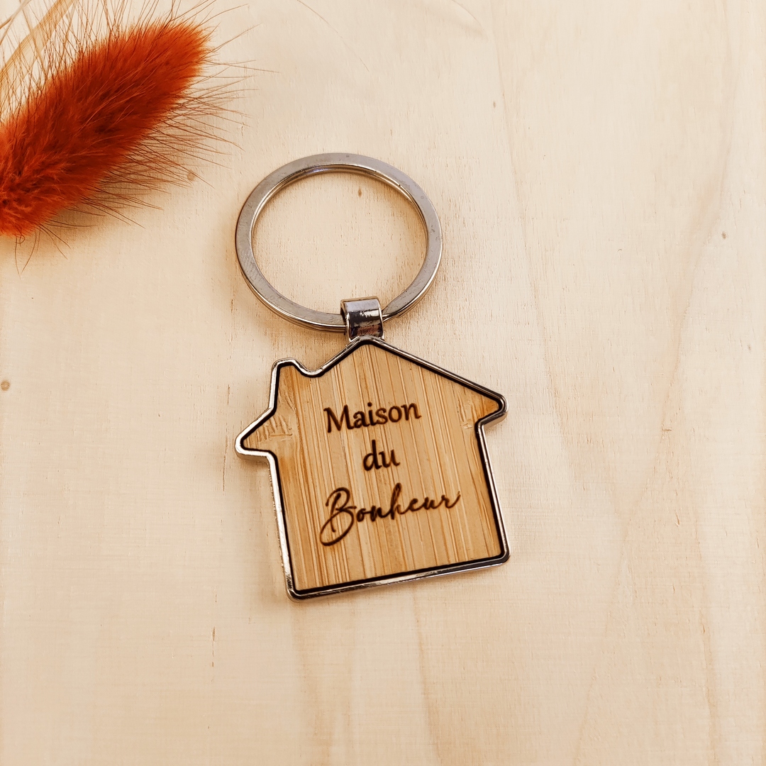 Porte-clés en forme de maison en bambou avec une finition en métal