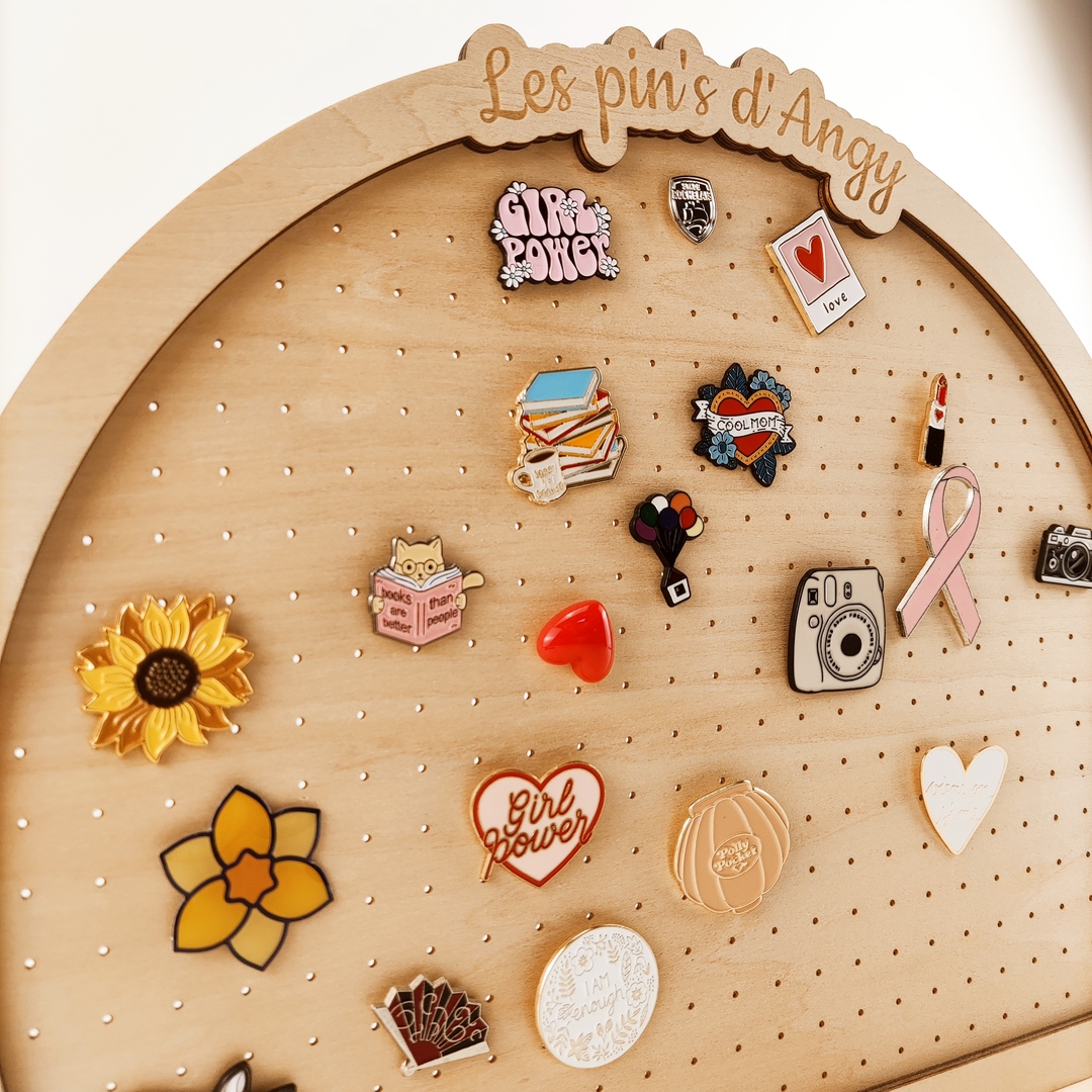 Présentoir gravé au laser avec prénom, doté de 386 trous arrondis pour un maintien optimal des pins.